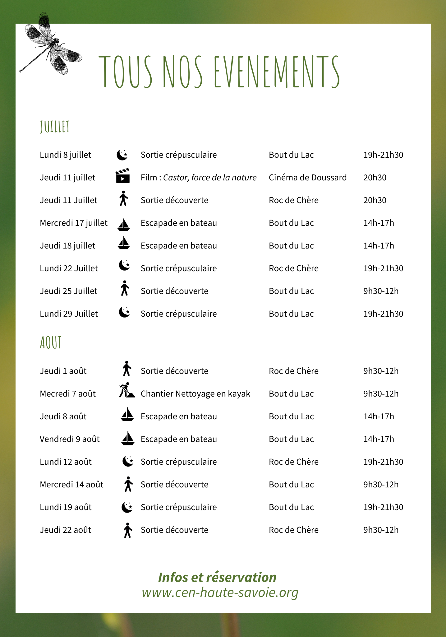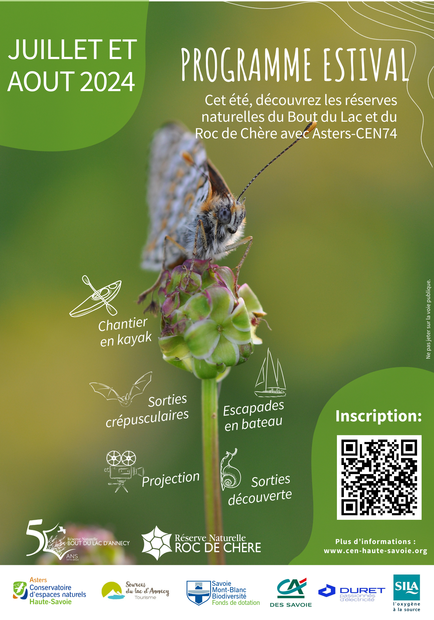 Du 08 juillet au jeudi 22 août, choisissez les activiés gratuites qui vous plaisent et inscrivez-vous ! Rendez-vous dans la rubrique "agenda" en cliquant ici pour réserver votre sortie dans la réserve naturelle du Roc de Chère ou du Bout du Lac d'Annecy. Sorties crépusculaires ou découvertes, ciné-débat, chantiers participatifs, escapades en bateau sur le lac.. il y en a pour tous !