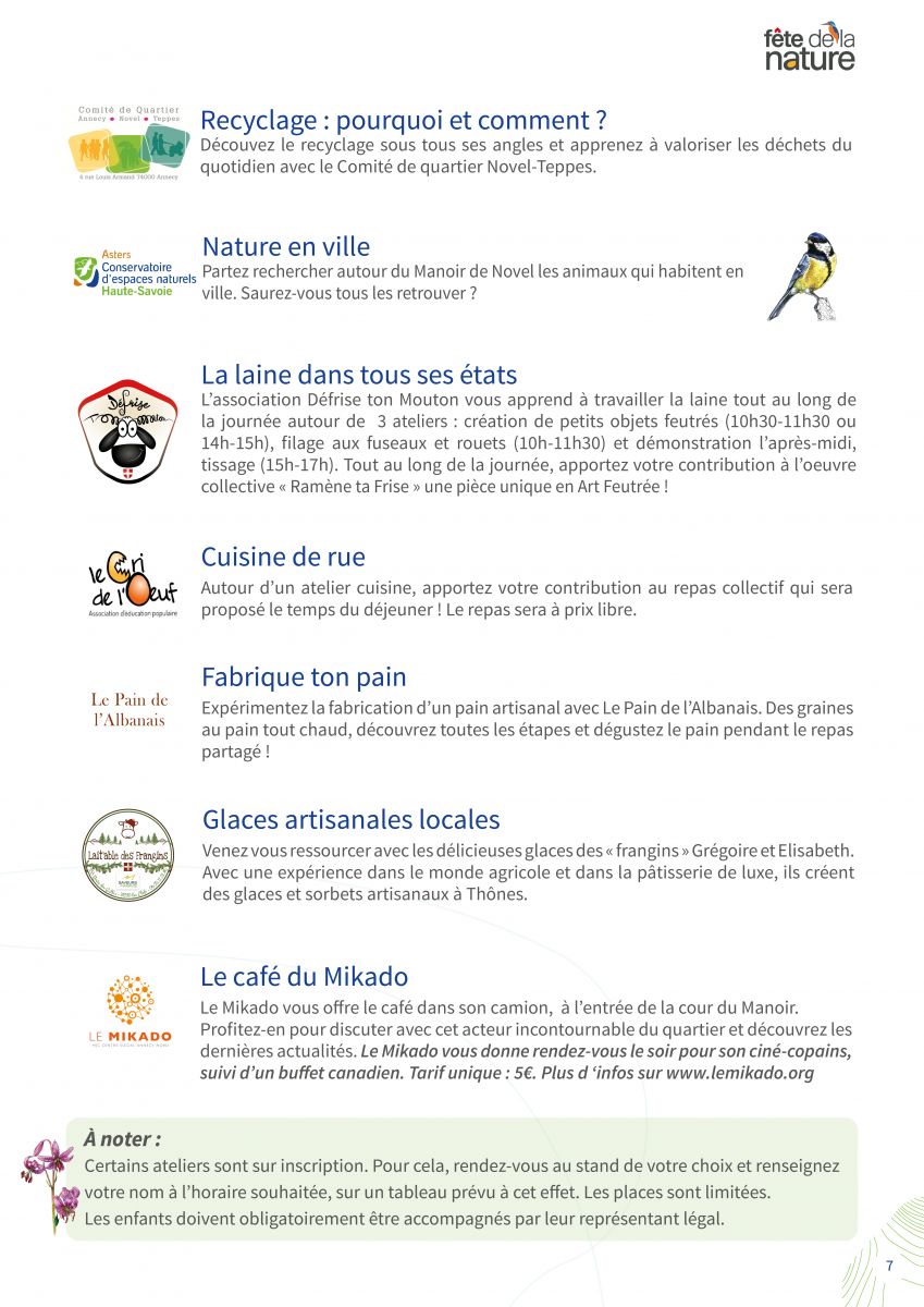 Tout au long de la journée, des ateliers seront animés par des associations, artistes et artisans locaux autour du thème "l'art et la nature". De nombreuses activités pour toute la famille : impressions sur tissus, ateliers dessins et peinture, création en laine, découverte des saveurs du jardin, contes, fabrication de pain, observations de la faune et de la flore. Les amateurs de cuisine pourront mettre la main à la pâte pour le repas partagé. Pour clore la fête, des choristes interprèteront des chansons de la variété française et du monde.