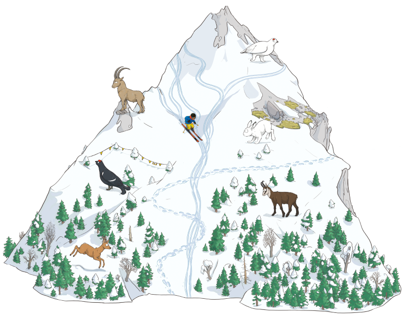En hiver, la faune entre en mode survie. Le froid, la rareté de la nourriture et la nécessité de limiter les dépenses énergétiques rendent chaque déplacement crucial. Pour un animal, fuir représente une perte d’énergie qui peut parfois lui coûter la vie, notamment en ce qui concerne le lagopède et le tétras-lyre. De manière à informer les skieurs de la présence de ces animaux, des zones de quiétude ont été délimitées dans certaines réserves naturelles.