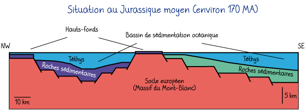 ![]() Figure 2.3 : Coupe simplifiée du secteur du massif du Mont-Blanc au Jurassique avec : le bassin sédimentaire de la couverture du Mont-Blanc (violet) et le bassin sédimentaire de la nappe de Roselette (vert, © NRG). |