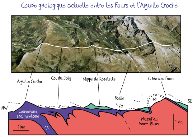 ![]() Figure 2.5 : Coupe géologique actuelle simplifiée du haut Val-Montjoie. La structure est complexe, plissée (Af = anticli- nale des Fours) et fracturée (Fcn = faille de la combe noire). Roselette est un lambeau d'une nappe fortement érodée |