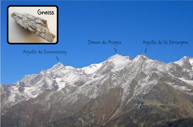 le Massif du Mont-Blanc : il correspond au socle autochtone (gneiss) et à sa couverture peu épaisse (grès, dolomies, schistes) lorsqu’elle n’a pas été érodée ;