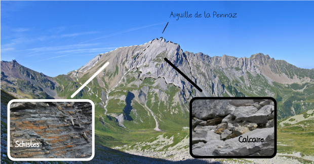 ![]() Figure 2.4 : Schistes argileux et calcaires massifs. Les schistes sont facilement érodés et produisent des sédiments fins : les schisteux ont souvent une pente régulière où les sédiments ont été équilibrés. À l'inverse, le calcaire massif est plus résistant et constitue les barres rocheuses et les dalles raides de la Pennaz (© NRG). |