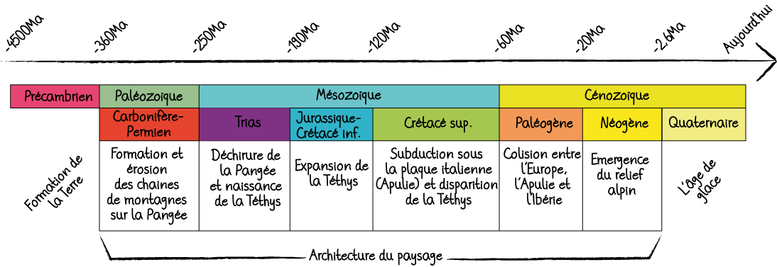 ![]() Figure 2.2 : Echelle de temps géologique et les principales étapes de l'histoire des Alpes évoquées dans cette partie (© NRG). |