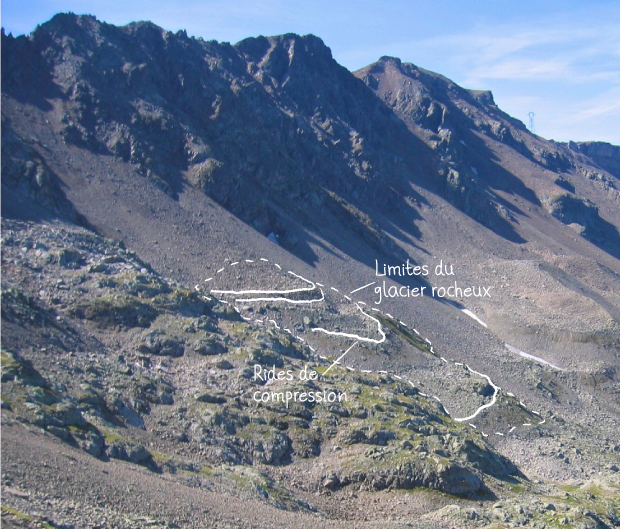 ![]() Figure 5.4: Glacier rocheux localisé sous le col des Tufs. L’eau qui pénètre dans les sédiments gèle en profondeur et entraîne le fluage généralisé vers l’aval (© NRG). |