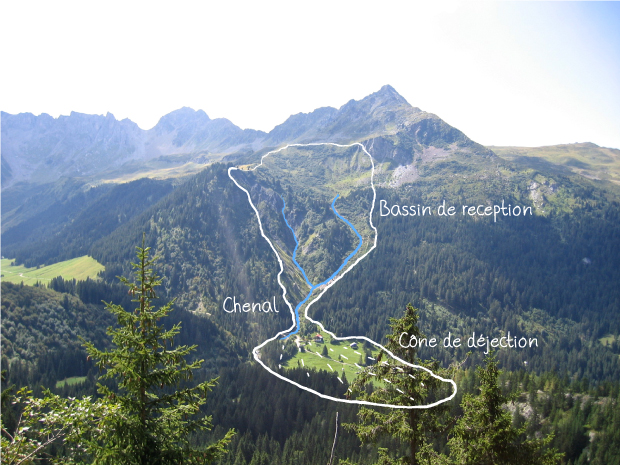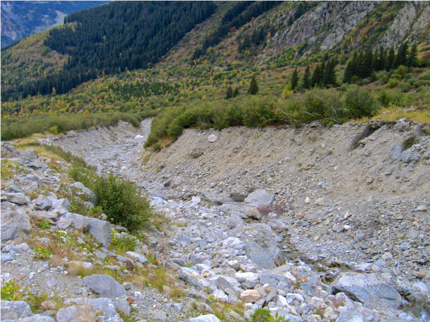 ![]() Figure 5.7: Le système torrentiel de Nant Borrant. En raison de la pente, des variations des précipitations (sécheresses/orages) et de l’érosion par les cours d’eau, les torrents alpins sont bien souvent composés de 3 parties distinctes : le bassin de réception en amont où les différentes cours d’eau érodent la roche, le chenal d’écoulement au centre où les cours d’eau se rejoignent et le cône de déjection à l’aval où les sédiments sont déposé en raison de l’adoucissement de la pente (© NRG). |