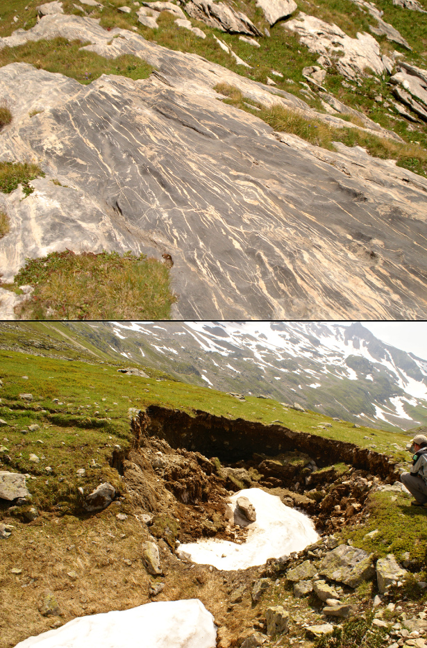 ![]() Figure 5.6: En haut, les effets de la dissolution des calcaires du col du Bonhomme : le ruissellement de l’eau génère des cannelures et des rigoles superficielles appelées lapiés. En bas, il s’agit des effets de la dissolution en profondeur des dolomies des environs des lacs Jovet : elle peut induire des écroulements instantanés de la surface comme ce fut le cas au début de l’été 2013. Geoffrey, ferait mieux de rester sur les sentiers car d’autres écroulements sont possibles (© NRG). |