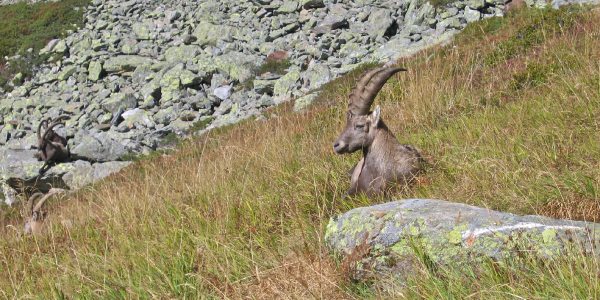 Figure 6.7: Bouquetins (capra ibex) estivant dans le vallon de Covagnet. L’espèce, peu craintive à l’égard de l’Homme, est presque entièrement exterminée dans les Alpes au 19ème siècle. Elle a été réintroduite, notamment depuis les années 60 et est protégée en France depuis 1981 (© NRG). |
