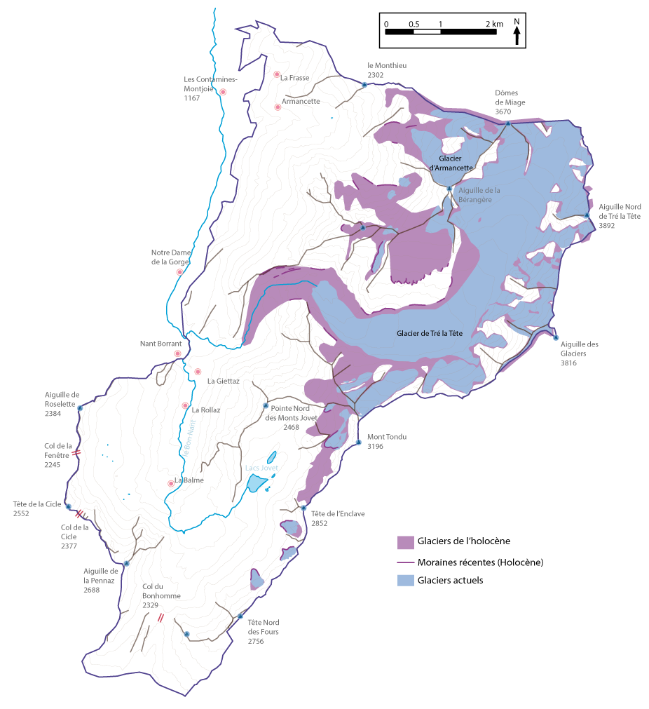 Figure 6.3 : Carte de l’extension glaciaire holocène (notamment le Petit Âge Glaciaire) et actuelle dans la Réserve des Contamines-Montjoie (cliquer pour agrandir, © NRG). |