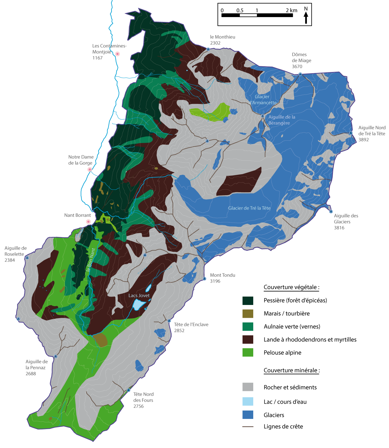 Si des tribus de chasseurs nomades sont présentes dans les Alpes depuis près de 50 000 ans, la sédentarisation de l’Homme dans le paysage alpin date seulement des derniers millénaires. Elle est donc très récente à l’échelle du temps géologique. Il y a 3 000 ans, le Val Montjoie est colonisé par les Ceutrons, une peuplade de cultivateurs d’origine ligure. Les sédentaires, qui forgent des outils toujours plus performants, cultivent la Terre (céréales), exploitent la forêt (bois), extraient le minerai présent dans les roches (métal) et possèdent du bétail. Très vite, le col du Bonhomme, en raison de sa situation géographique et sa facilité d’accès, devient un lieu de passage important. Le village des Contamines et des nombreux alpages se développent (figure 6.8). À l’instar de nombreuses autres situations alpines, la pression de cette société agro-pastorale sur l’environnement s’intensifie et atteint son paroxysme (surcharge des alpages, déforestation maximale, problème de famine et de crues répétées, etc.) autour du 19ème siècle dans le Val Montjoie et contraint une émigration importante. Cette société connaît une profonde mutation au 20ème siècle avec le développement de l’industrie (usines dans la vallée de l’Arve et hydroélectricité dans le haut Val Montjoie) et surtout du tourisme. Essentiellement tourné vers les sports d’hiver, le tourisme modifie profondément la situation socio-économique et l’environnement dans le haut Val-Monjoie. Ainsi, voulant équilibrer le territoire communal entre l’espace occupé par l’Homme (fond de vallée et domaine skiable) et l’espace naturel, les élus locaux décident de créer une réserve naturelle pour protéger les secteurs du massif du Mont-Blanc et de Roselette/Pennaz. Celle-ci verra le jour en 1979 et couvre actuellement 55 km2. L’influence de l’Homme sur le paysage est discutée plus en détail dans le chapitre 8.