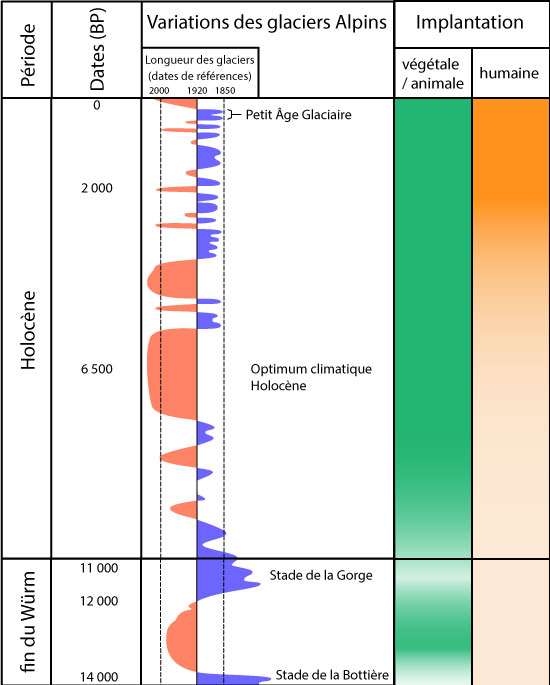 Figure 6.2 : Chronologie du retrait glaciaire depuis 14 000 ans (adaptée d’après glacier-climat) et implantation progressive de la flore, de la faune et de l’Homme dans la vallée du Bon Nant (© NRG). |