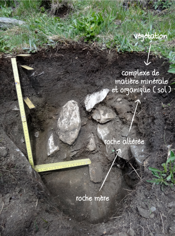 Figure 6.4 : Profil réalisé dans les Alpes (Val de Moiry, Valais). Le sol est issu de la rencontre entre les éléments minéraux et organiques (photo T.Ferber, © NRG). |